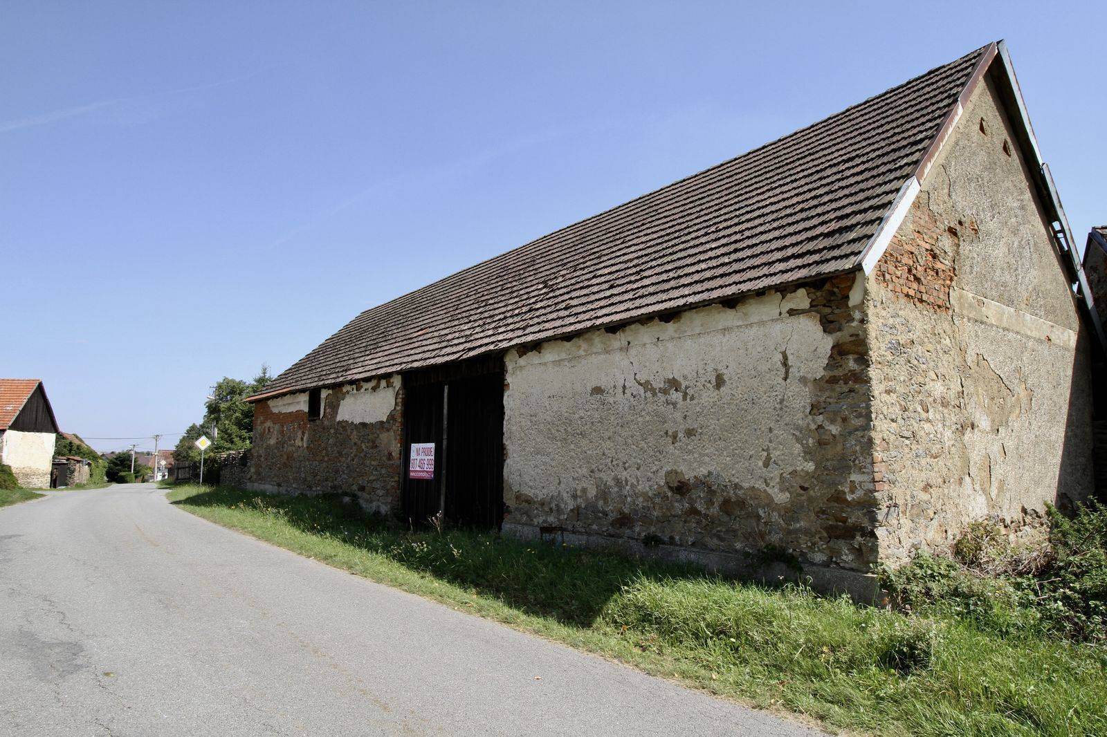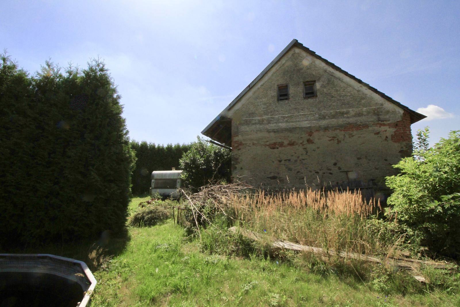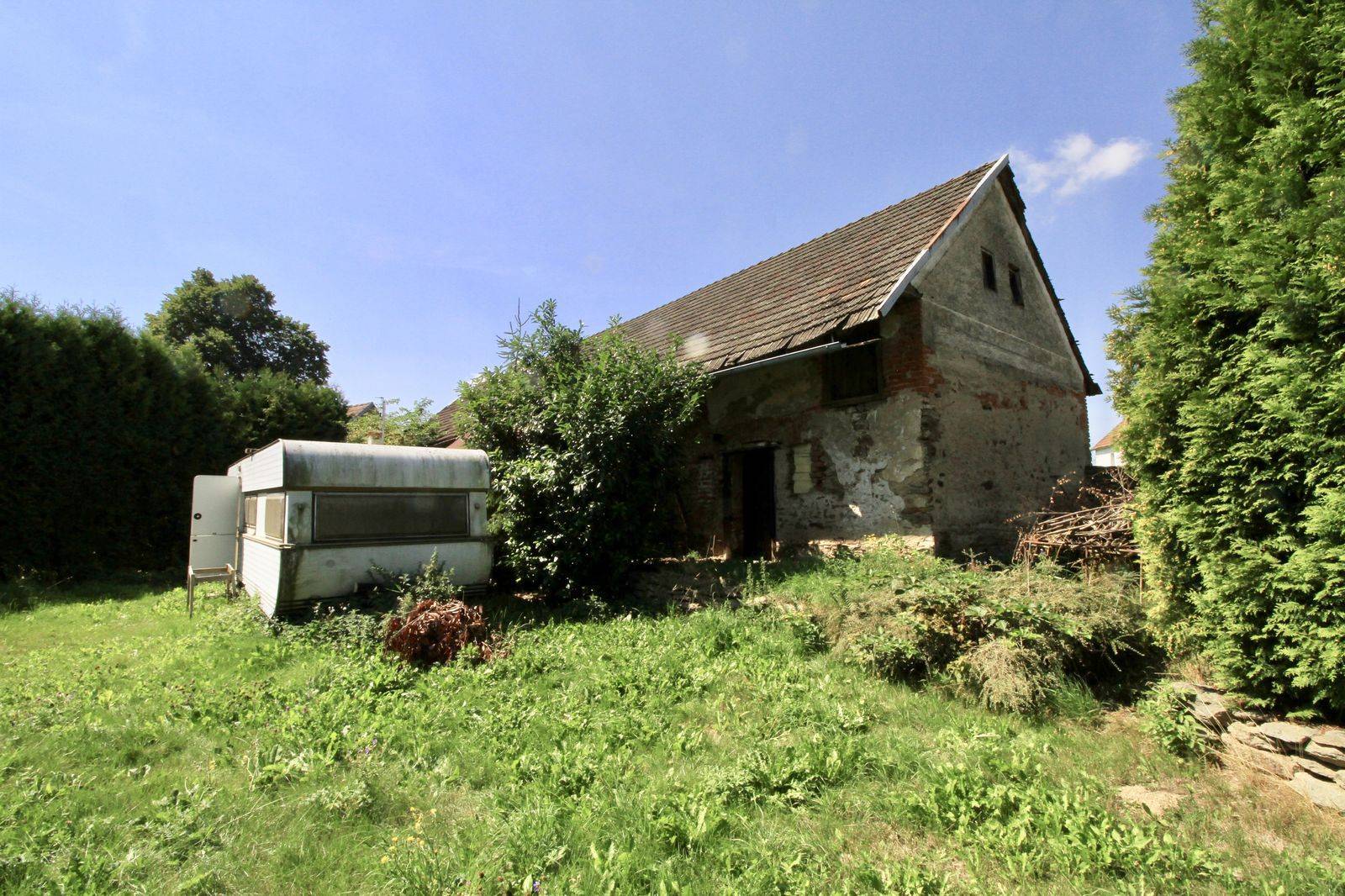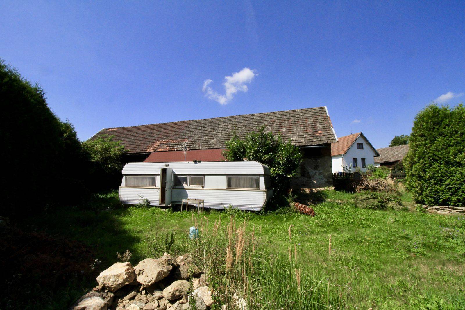Nabízíme k prodeji chalupu s číslem popisným, kde je započata obytná vestavba a nyní je připravena na dokončení dle představ nového majitele. Součástí stavení je průjezdná stodola (80 m2). Na pozemku je obecní vodovod a elektřina. Stavení je na pozemku - zahradě (550 m2), na kterém je k dispozici prostorný obytný karavan a zapuštěný bazén. Domamyšl je 19 km od Tábora a 10 km od Pacova.